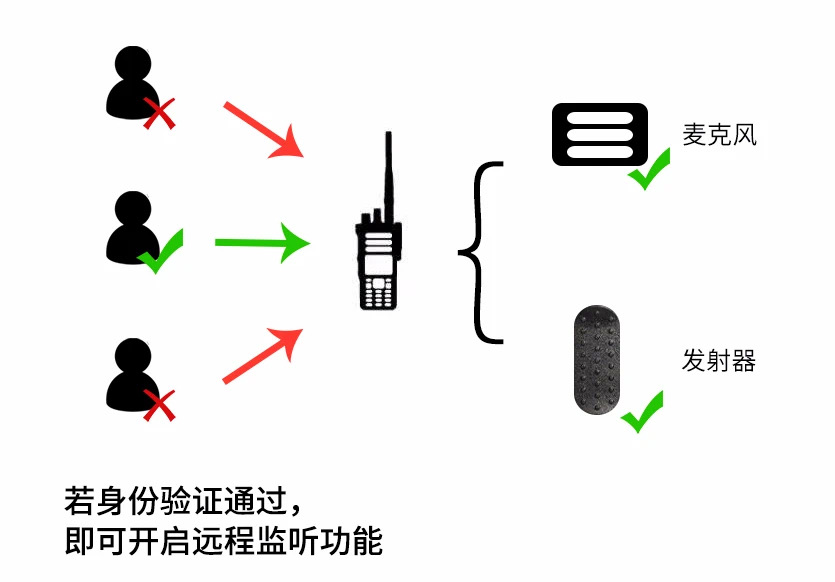 需要身份驗證的對講機遠程監(jiān)聽功能,允許用戶通過菜單向目標對講機發(fā)起遠程監(jiān)聽請求。請求成功后,目標對講機的麥克風和發(fā)射器將被激活,以便遠程監(jiān)聽。
