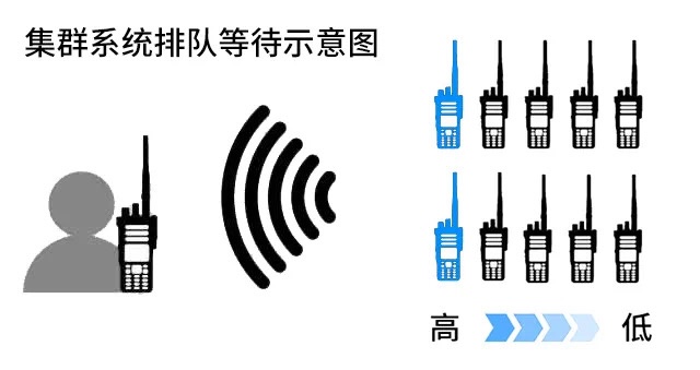 集群系統(tǒng)中當用戶在排隊等待語音信道時,高優(yōu)先級用戶排在前面,低優(yōu)先級排在后面。這有助于實現(xiàn)重要通話和緊急通話的優(yōu)先傳送。