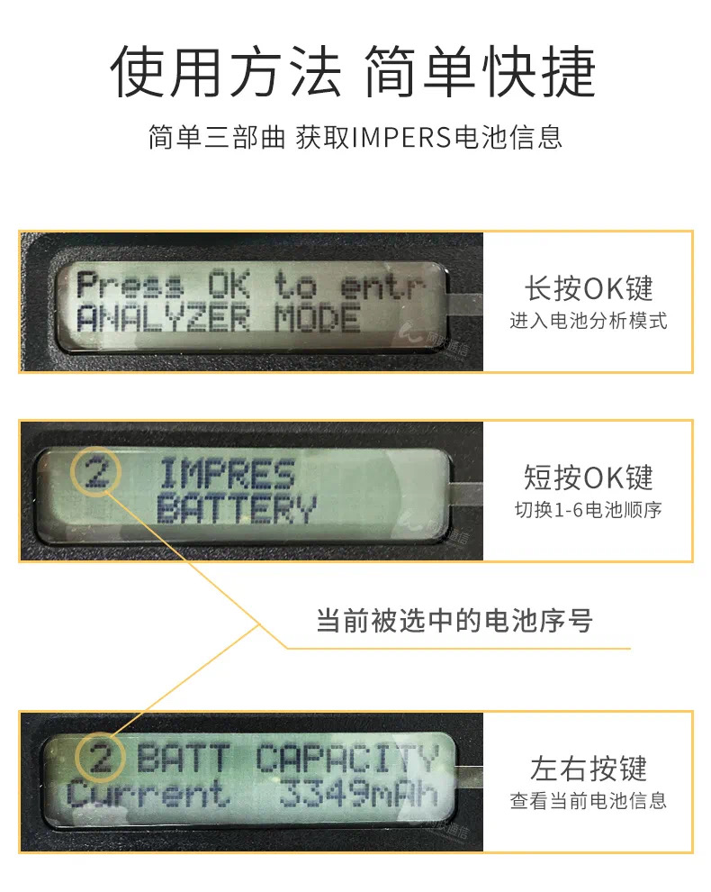 2代IMPRES智能六聯(lián)充,突破1代顯示屏只能查看第1個(gè)充電插槽中IMPRES電池信息,增設(shè)切換按鍵,無(wú)需反復(fù)插拔電池,便可獲取6個(gè)充電插槽中任意1個(gè)IMPRES電池的相關(guān)信息。