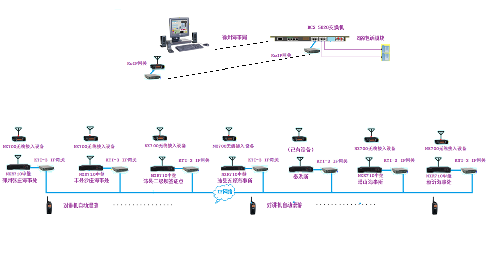 徐州市地方海事局無線數(shù)字聯(lián)網(wǎng)通信系統(tǒng)日前正式開通使用。本系統(tǒng)結(jié)合徐州地方海事局管理范圍點(diǎn)多面長的特點(diǎn),采用先進(jìn)的建伍數(shù)字IP聯(lián)網(wǎng)系統(tǒng)。既解決了各個(gè)點(diǎn)工作通信的需要,又滿足全線統(tǒng)一調(diào)度的工作需要。